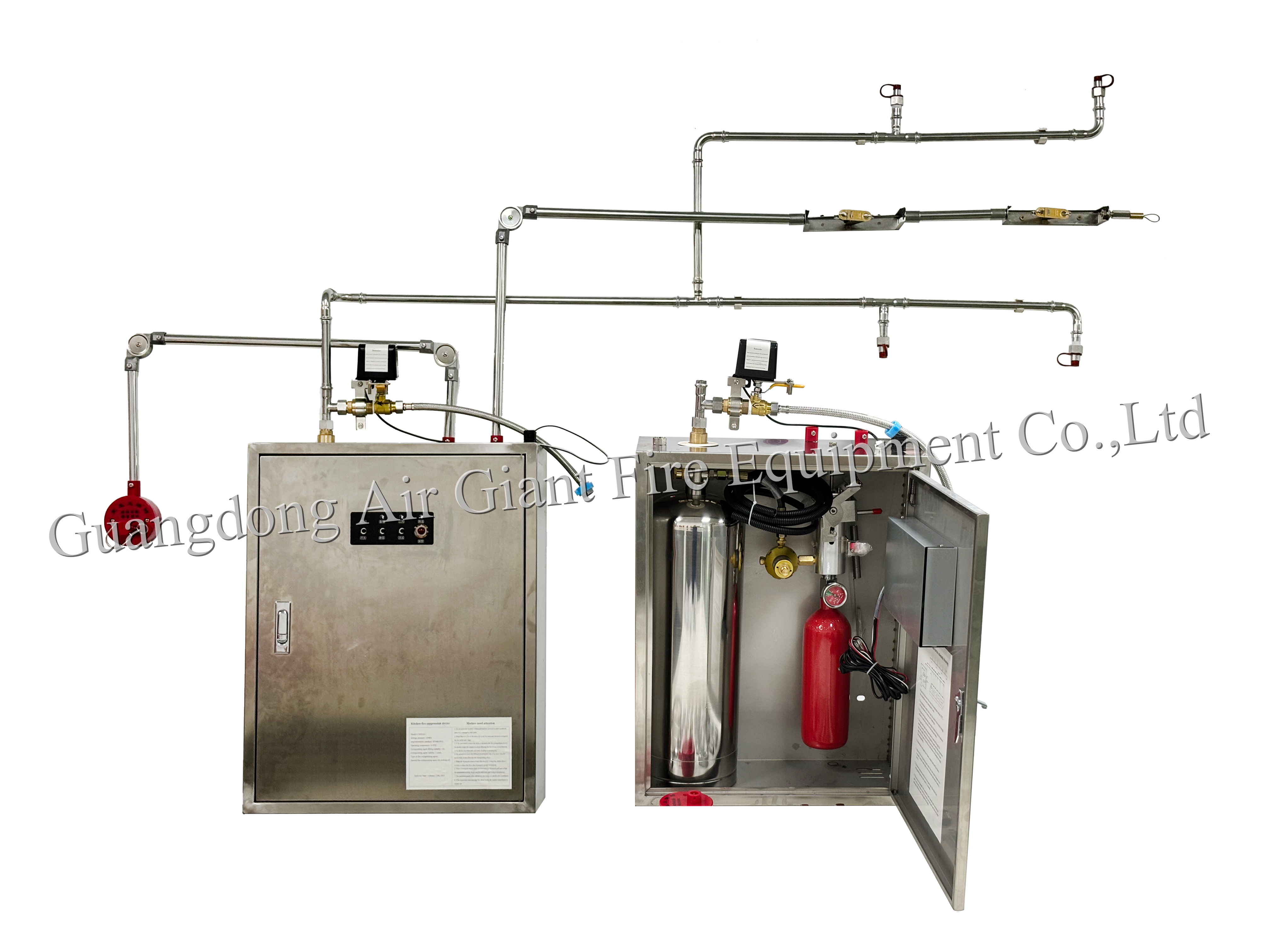 1.2 Uwolnienie środka gaśniczego: Po aktywacji systemu gaszenia pożaru, uwalnia on środki gaśnicze (takie jak proszek gaśniczy, środki na bazie wody itp.) przez dysze atomizacyjne, rozpylając je na garnek z olejem i wewnątrz okapu. Środki te albo reagują chemicznie z płonącym olejem, albo fizycznie go izolują, tworząc warstwę ochronną, która odcina dopływ powietrza i gasi płomienie.