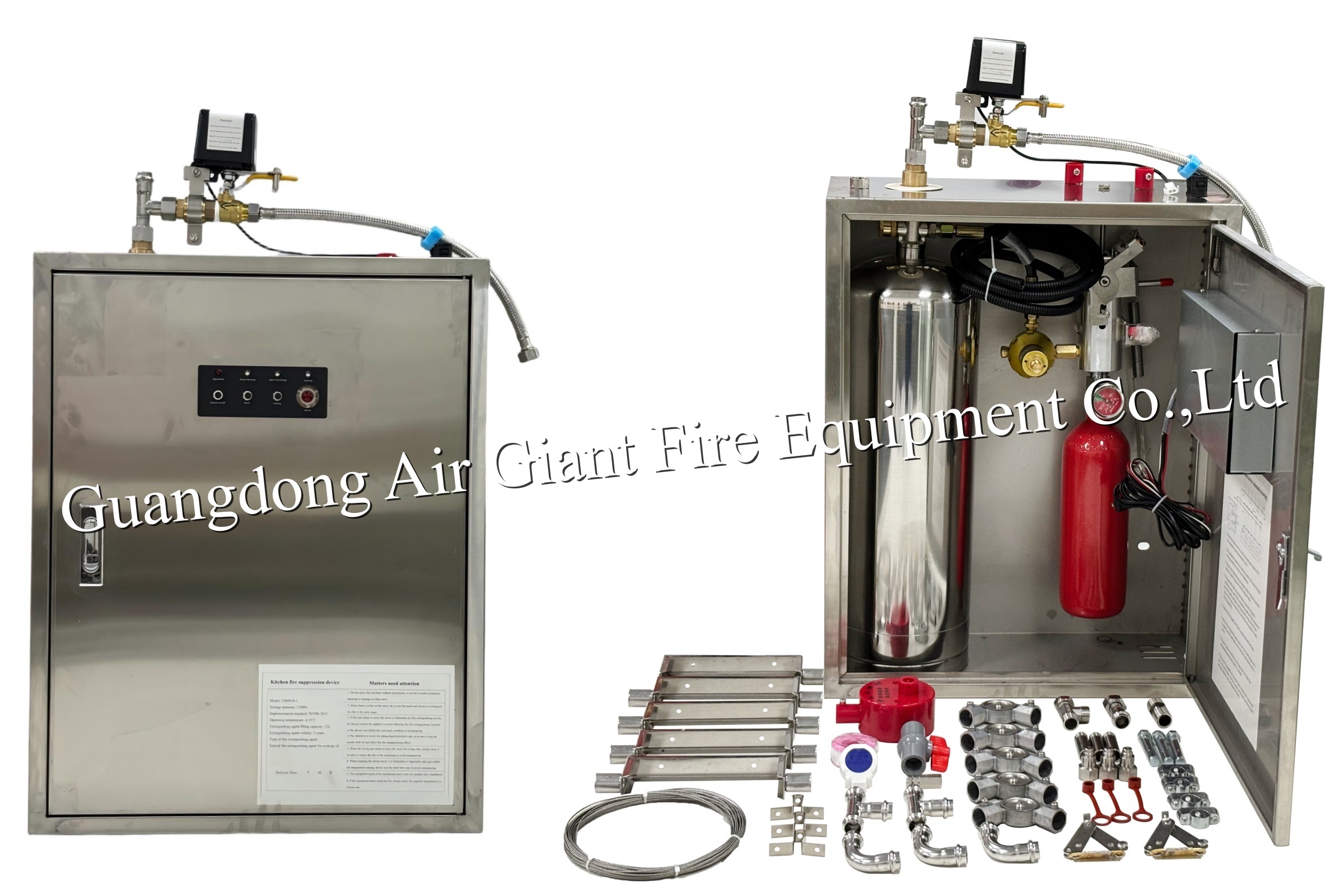 1.2Uwolnienie środka gaśniczego: po uruchomieniu układu gaśniczego uwalnia środki gaśnicze (takie jak proszek suchy, środki na bazie wody itp.) przez dysze atomujące,Spryskiwanie ich na garnku oleju i wewnątrz maszynyŚrodki te albo reagują chemicznie z palącym się olejem, albo fizycznie go izolują, tworząc warstwę pokrywającą, która odcina dopływ powietrza i gaśnie płomienie.