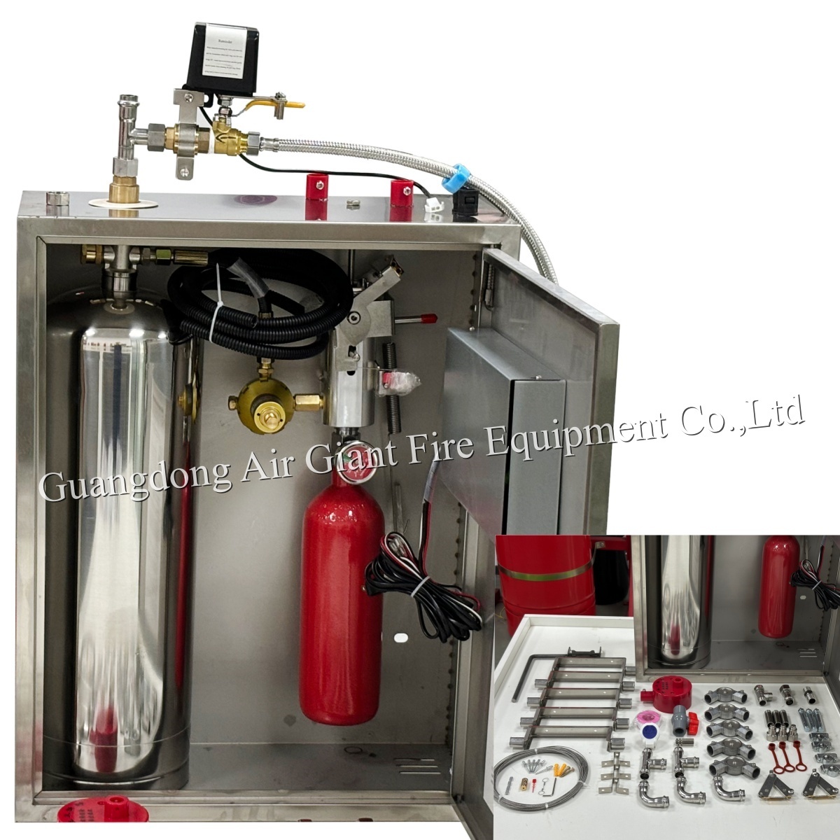2Typ gaśnika: Niektóre systemy gaśnicze kuchenne wykorzystują gaz pod wysokim ciśnieniem do napędzania gaśnika.mechaniczny siłownik przebija butelkę gazową pod wysokim ciśnieniem, uwalniając gaz o wysokim ciśnieniu do zaworu obniżającego ciśnienie.wciśnięcie środka przez rury do dyszek do opryskiwania.